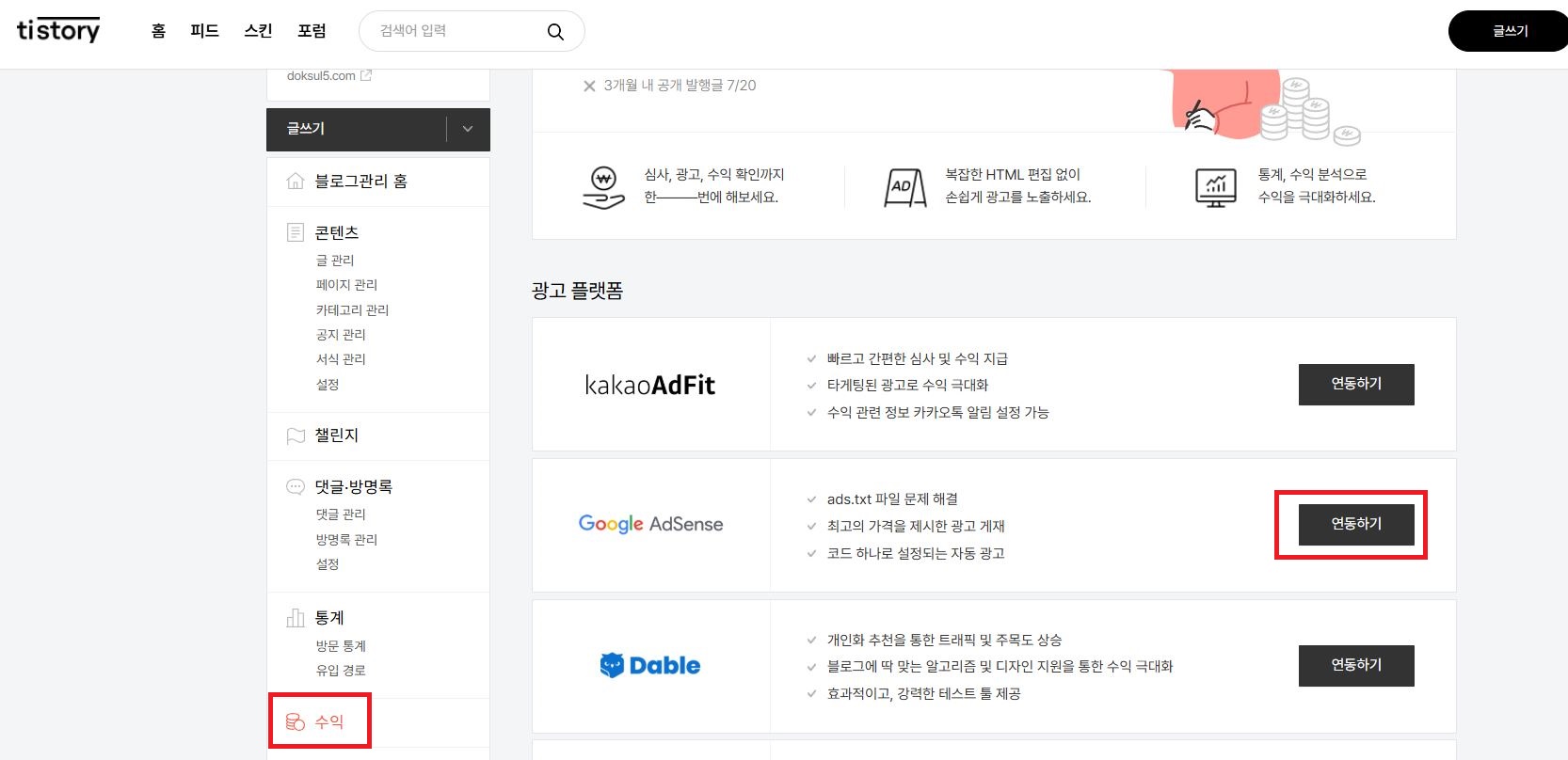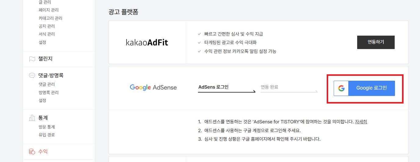 좌측 메뉴에서 [수익]을 누르면 광고플랫폼이 위와 같이 뜬다.