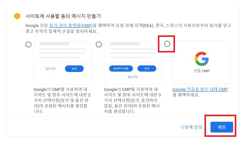 세 번째 [사이트에 사용할 동의 메시지 만들기]에서 마지막 동그라미에 체크하고 제출하면 완벽하게 끝이다.
