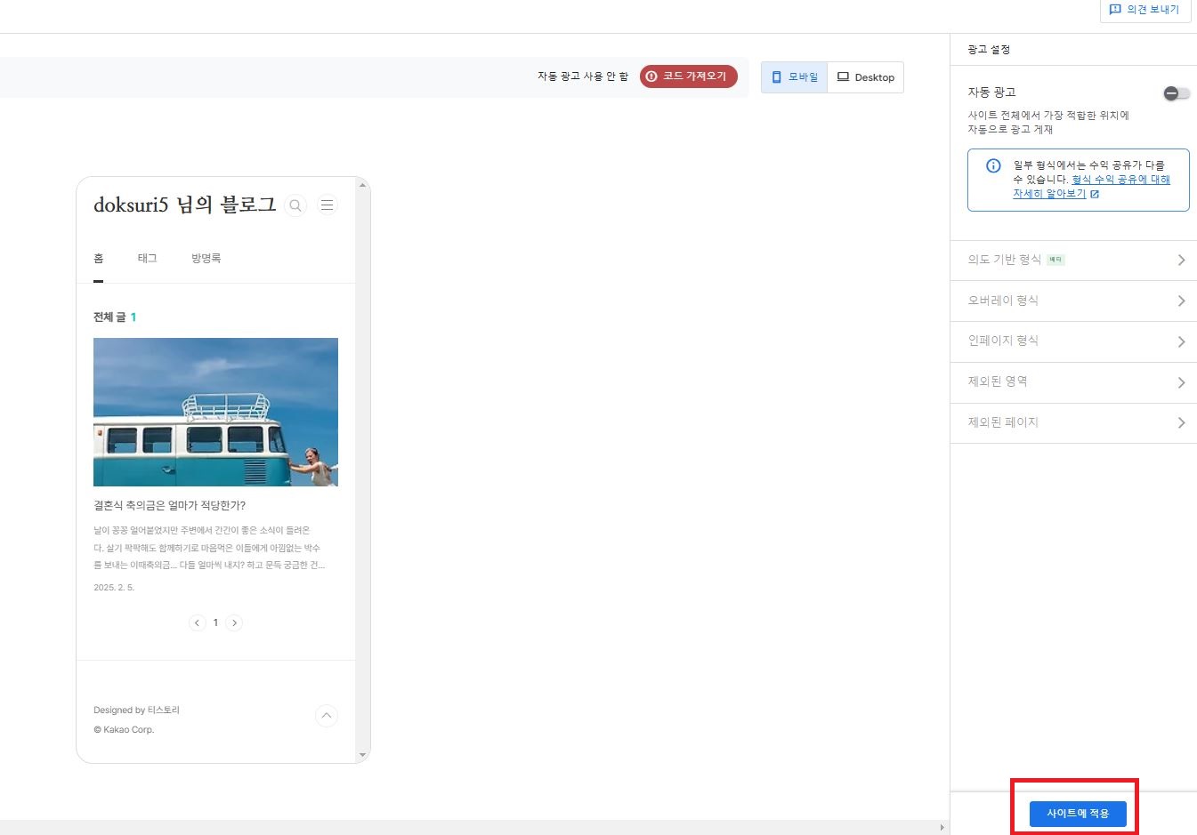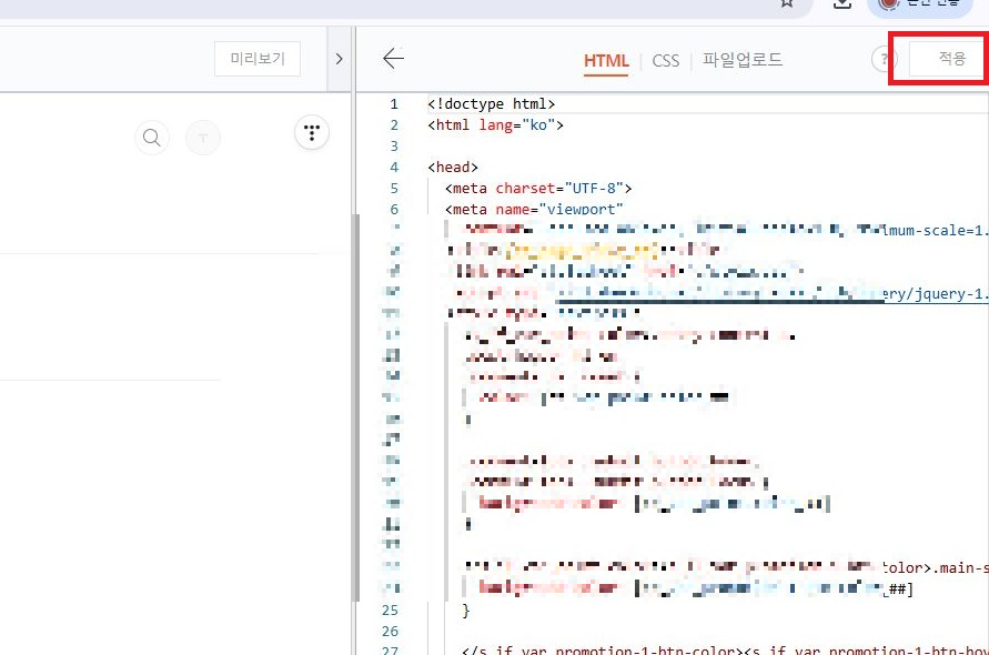 코드가 삽입되었다면 우측 상단 [적용]을 눌러준다.