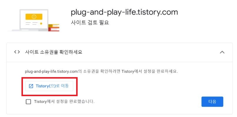 먼저 맨 위의 [사이트 소유권을 확인하세요]에서 [Tistory(으)로 이동]을 클릭