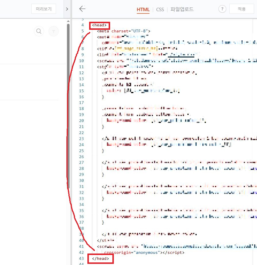 나는 위에서 보이는 것과 같이 </head> 바로 위에 코드를 붙여 넣었다. (41-42줄)