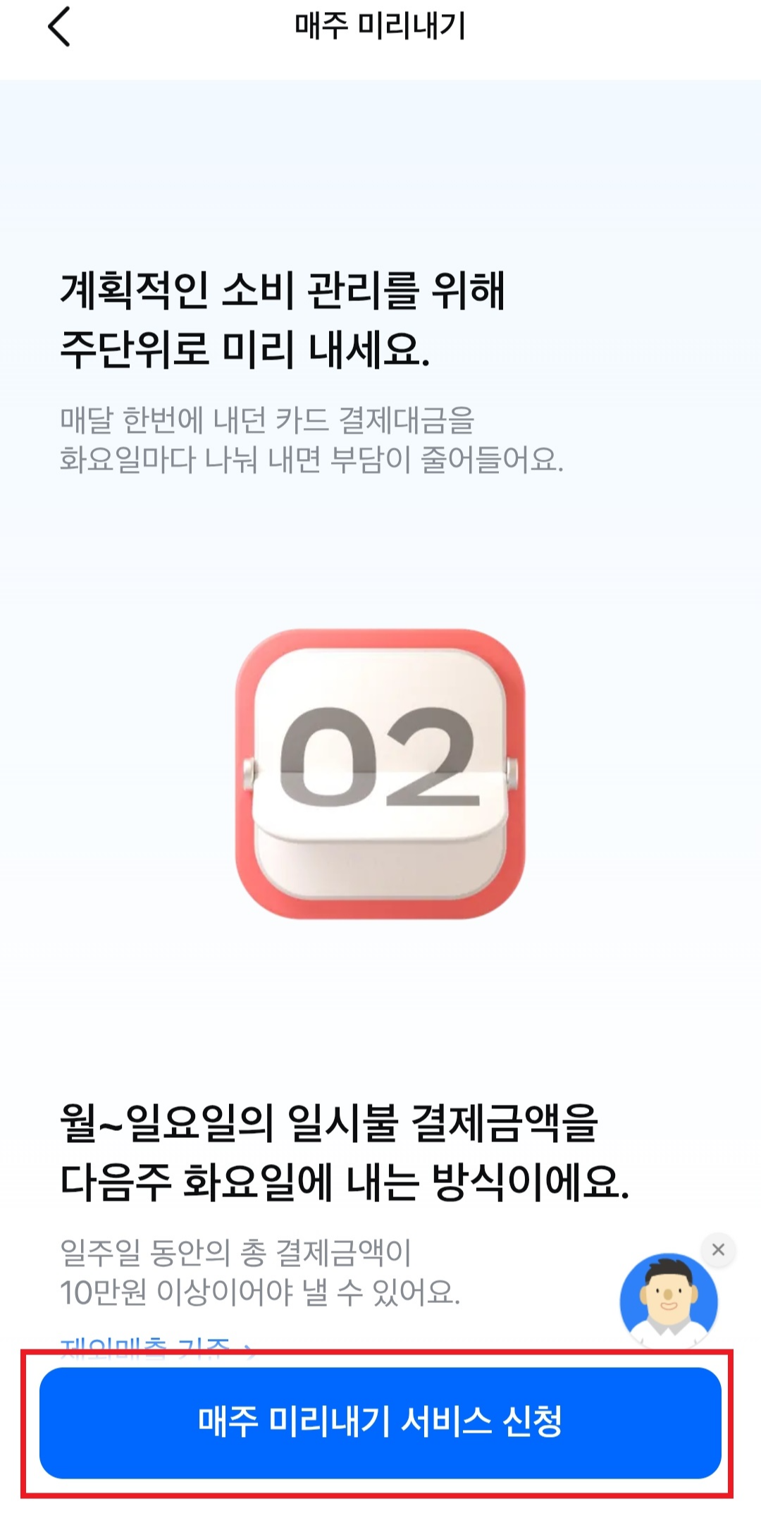 이 서비스는 매주 사용한 카드 대금을 다음 주에 자동으로 결제하여 월말에 몰리는 부담을 줄여준다.