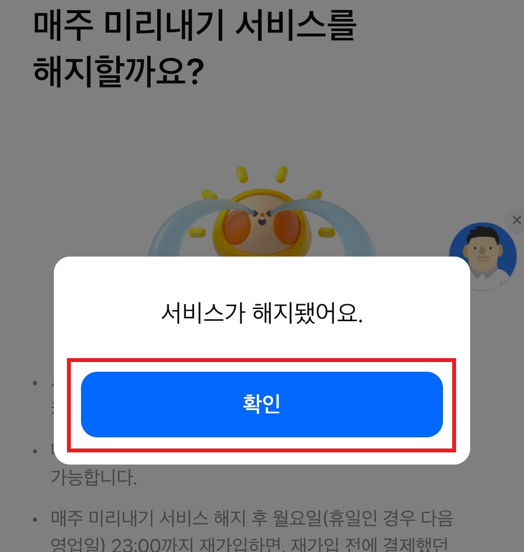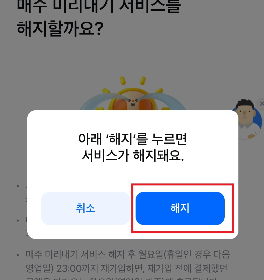 팝업으로 나오는 [해지] [확인]까지 차례로 누르면 끝이다.