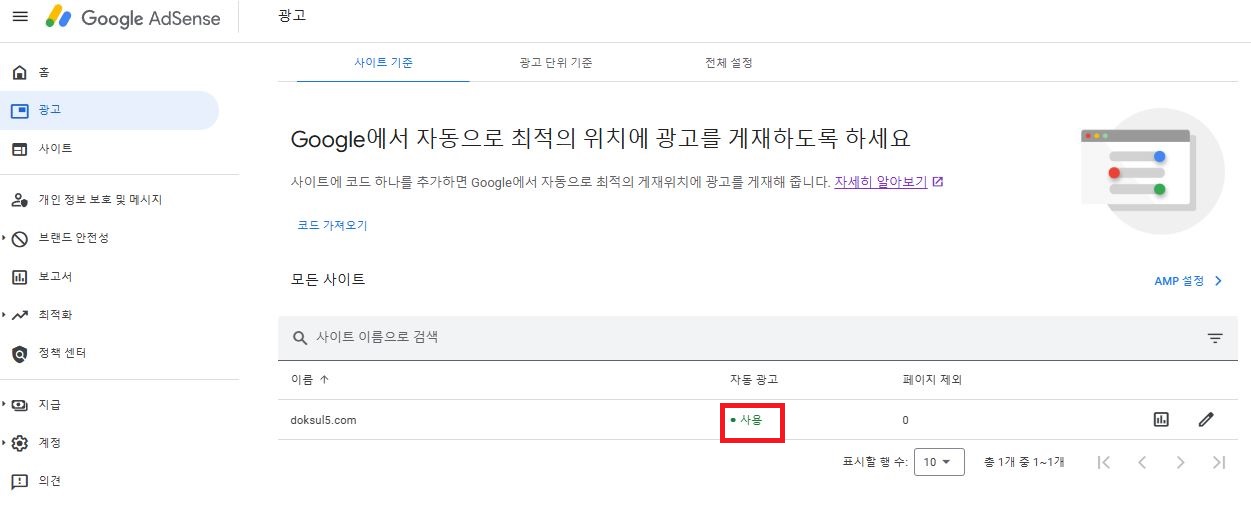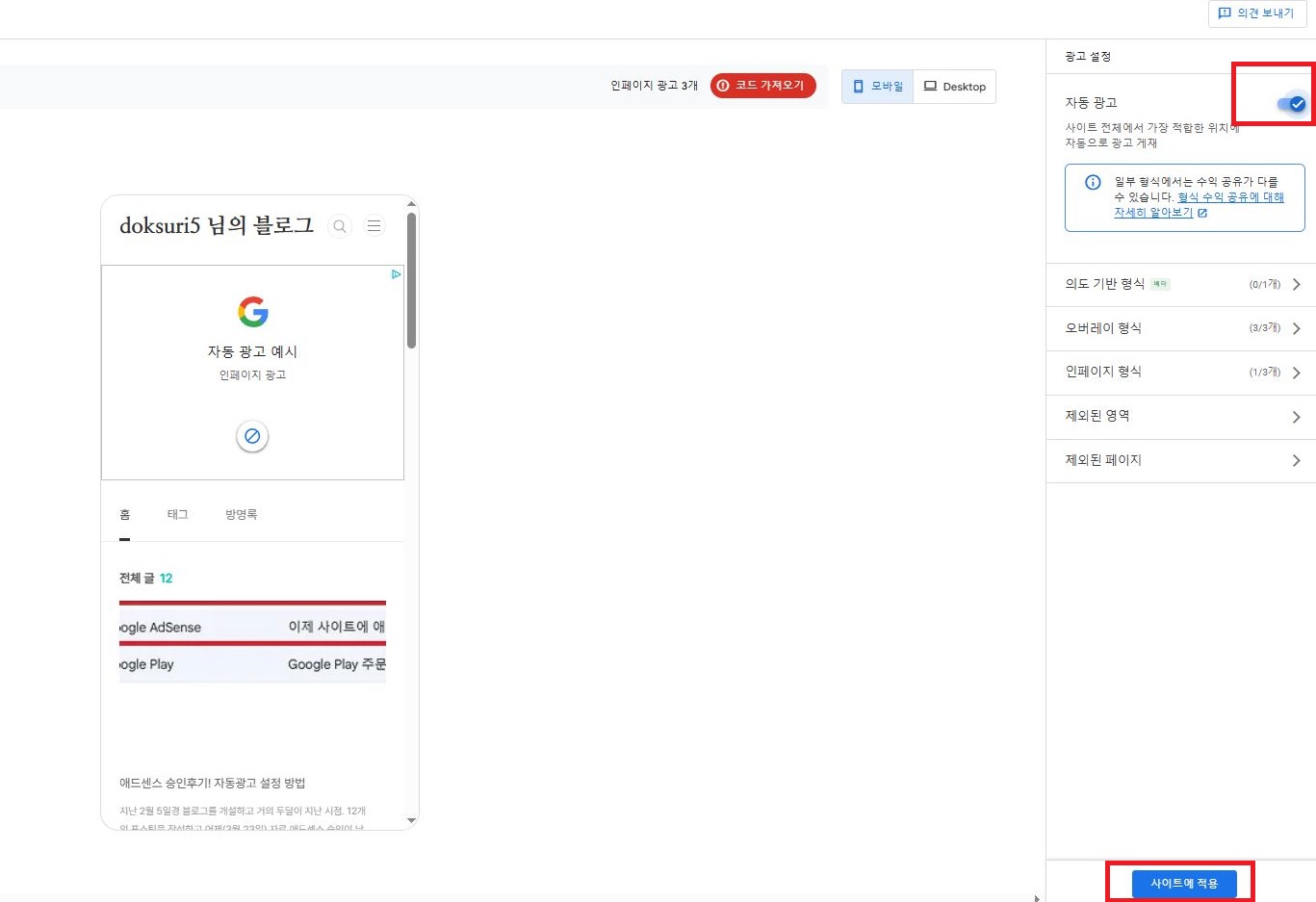 이제 자동광고를 이용해 볼까 하여 설정을 다시 했다.