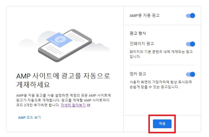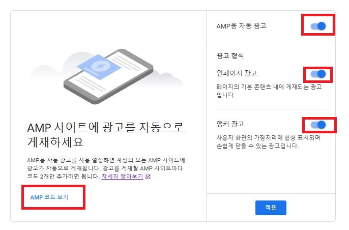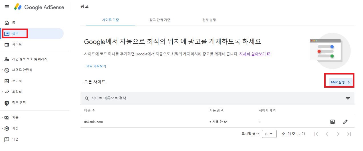 왼쪽 메뉴 중 [광고]를 클릭하면 나오는 페이지 우측 중앙에 [AMP설정]을 누른다.