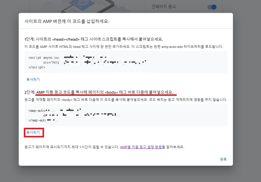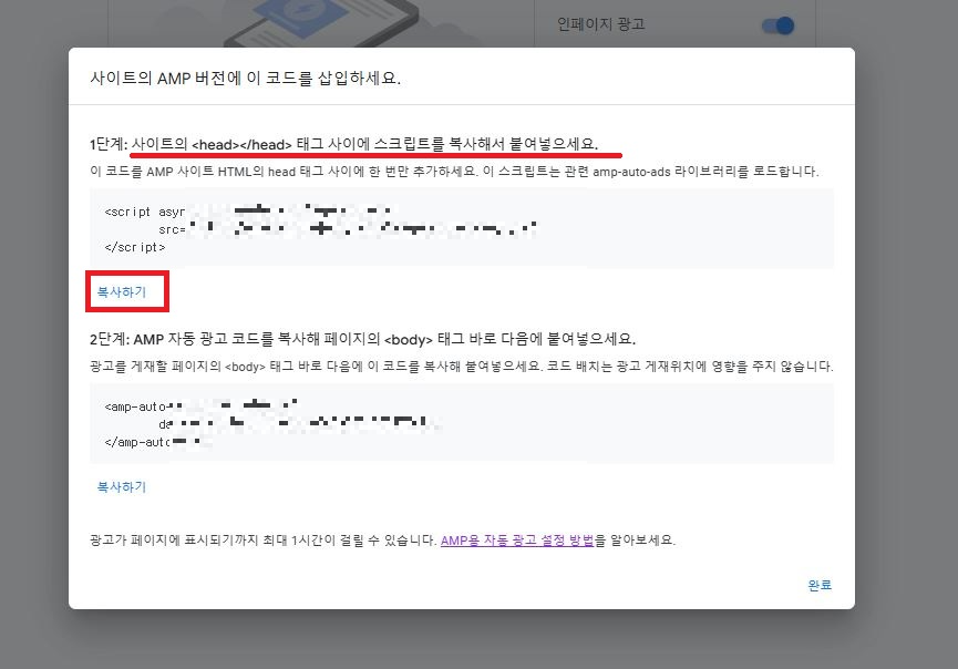 자동광고를 설정하기 위해 코드 두 가지를 블로그에 붙여 넣어야 한다.
