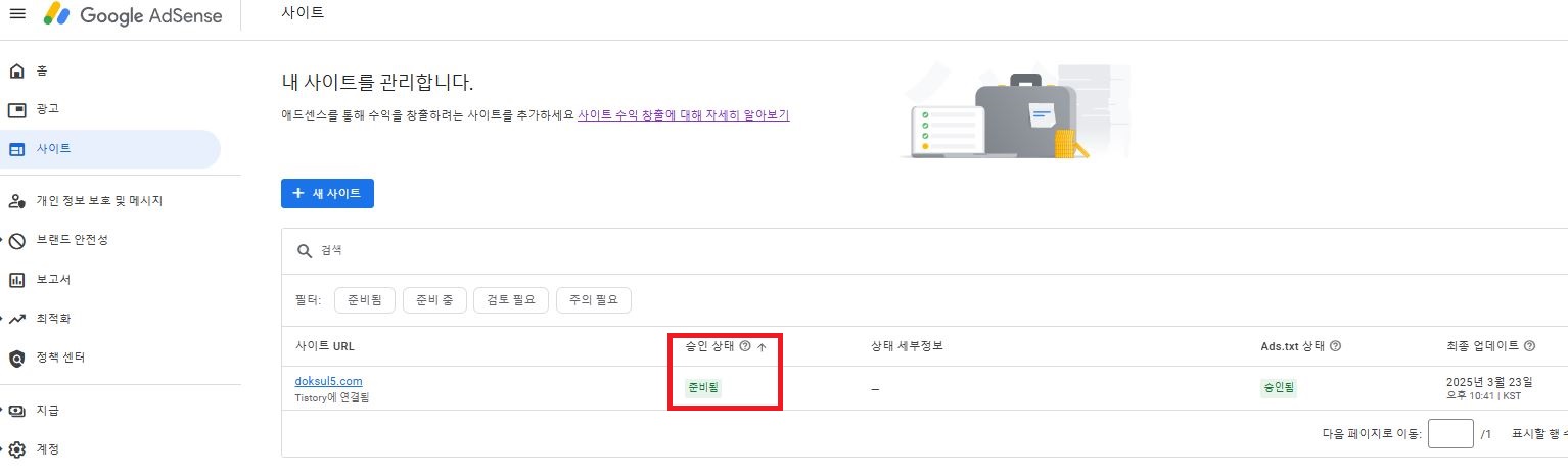 우측 메뉴에서 [사이트] 로 들어가니 승인상태가 '준비됨'으로 바뀌었다.
