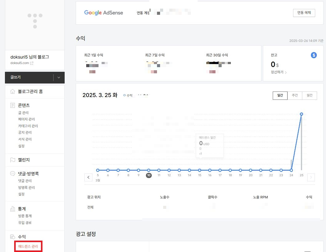 수익 > [애드센스 관리]를 클릭한다.
