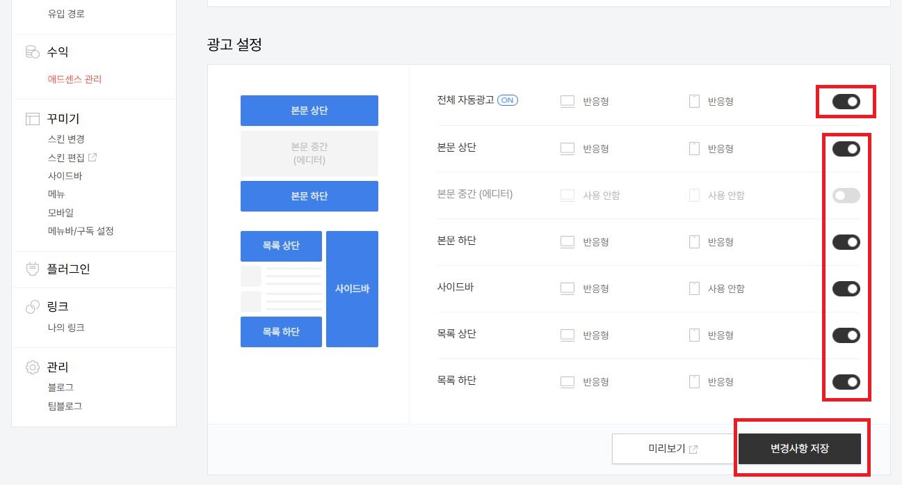 여기서 미리 보기를 누르면 실제 페이지에 어떻게 광고가 들어가는지 볼 수 있다.