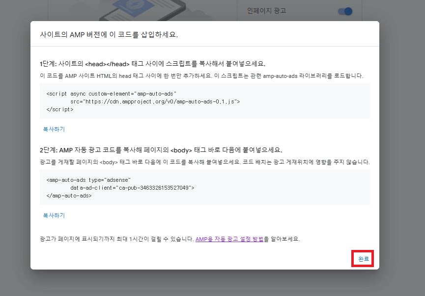 다시 애드센스 창 우측 하단 [완료]를 클릭한다.