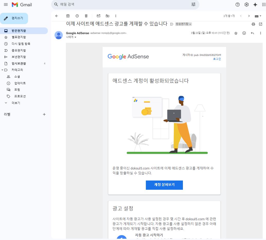 애드센스 계정이 활성화되었다는 반가운 메시지가!!