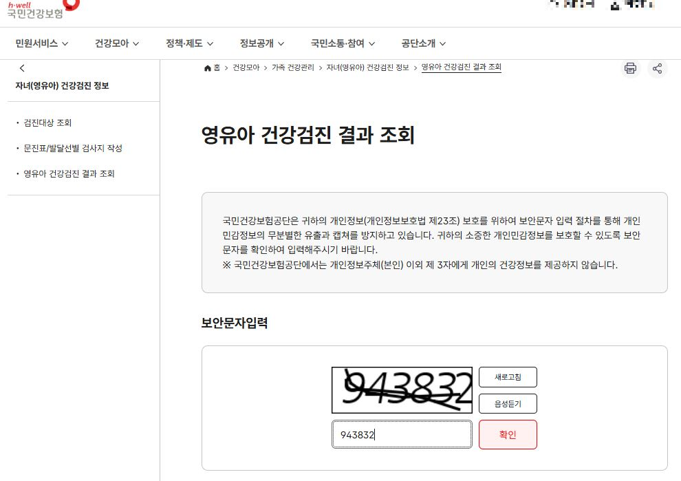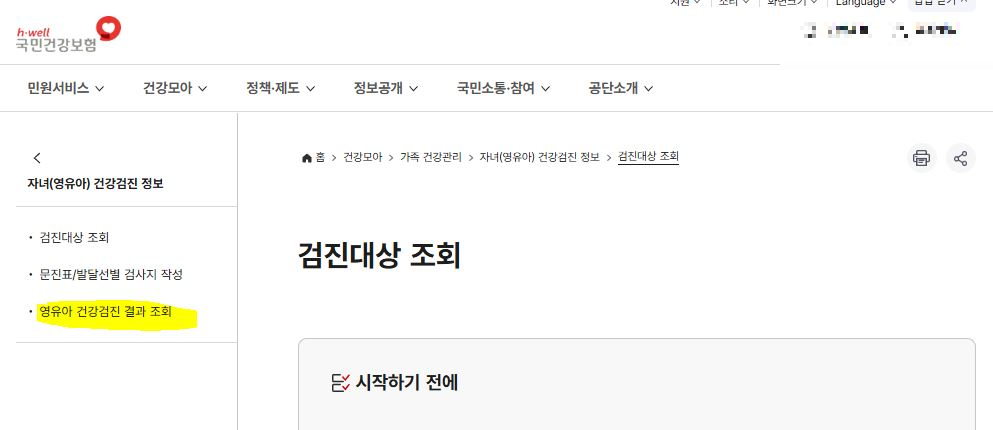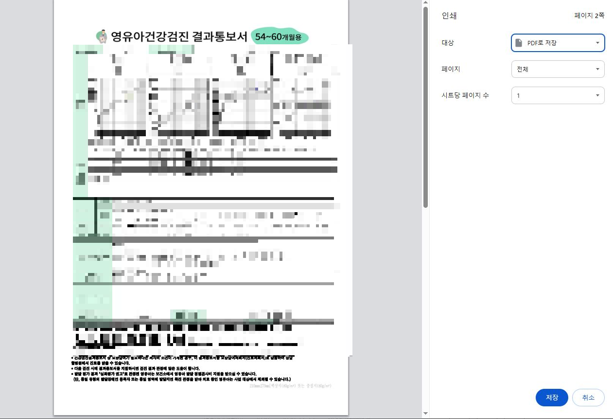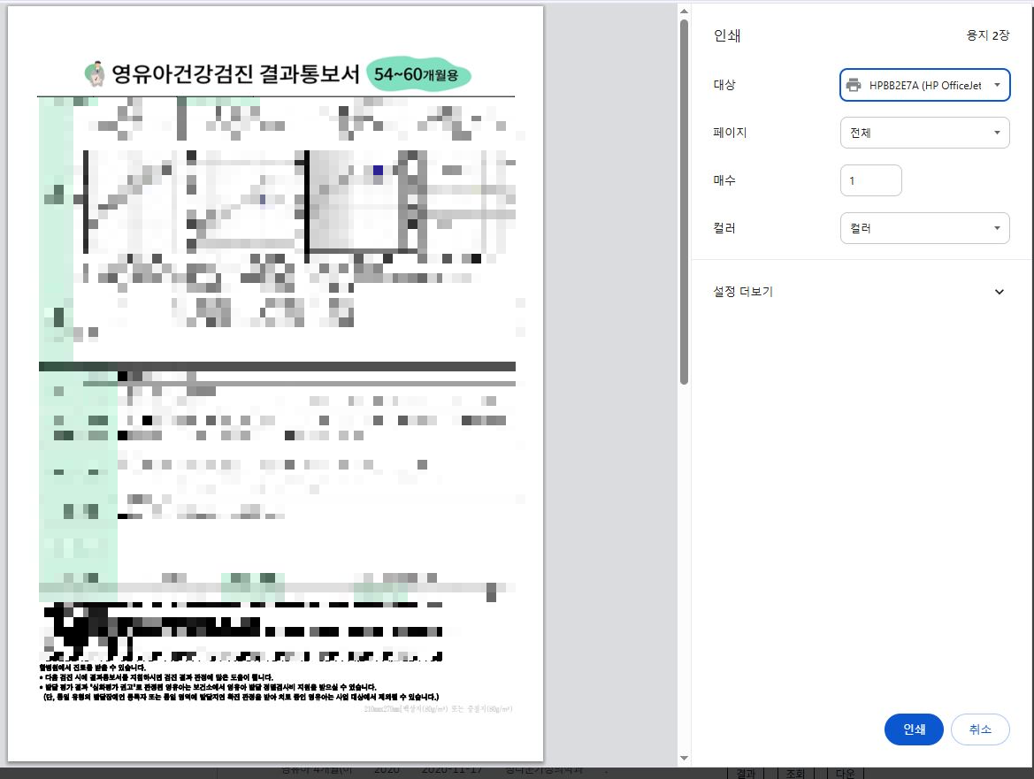 여기서 가장 최근에 시행한 영유아 검진 결과를 출력하면 된다.