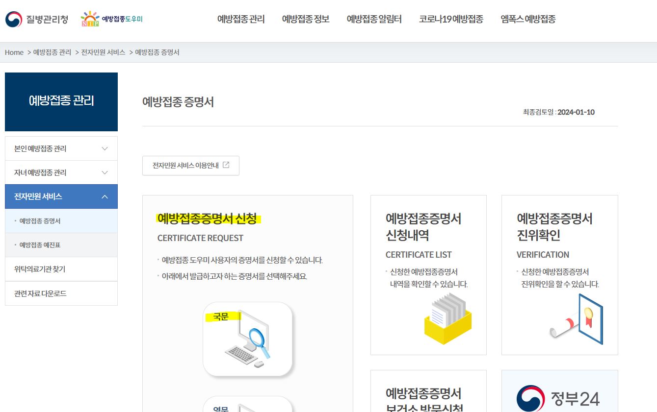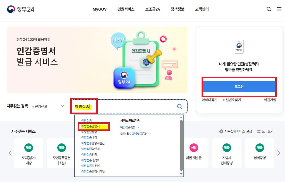 인증 후 첫 화면에서 [예방접종증명서]를 검색한다.