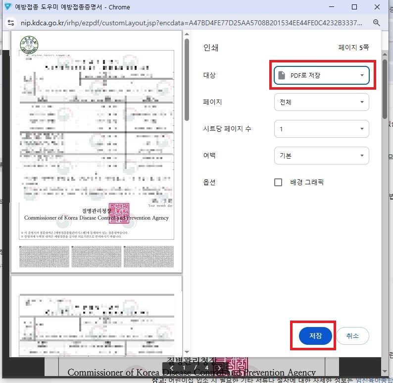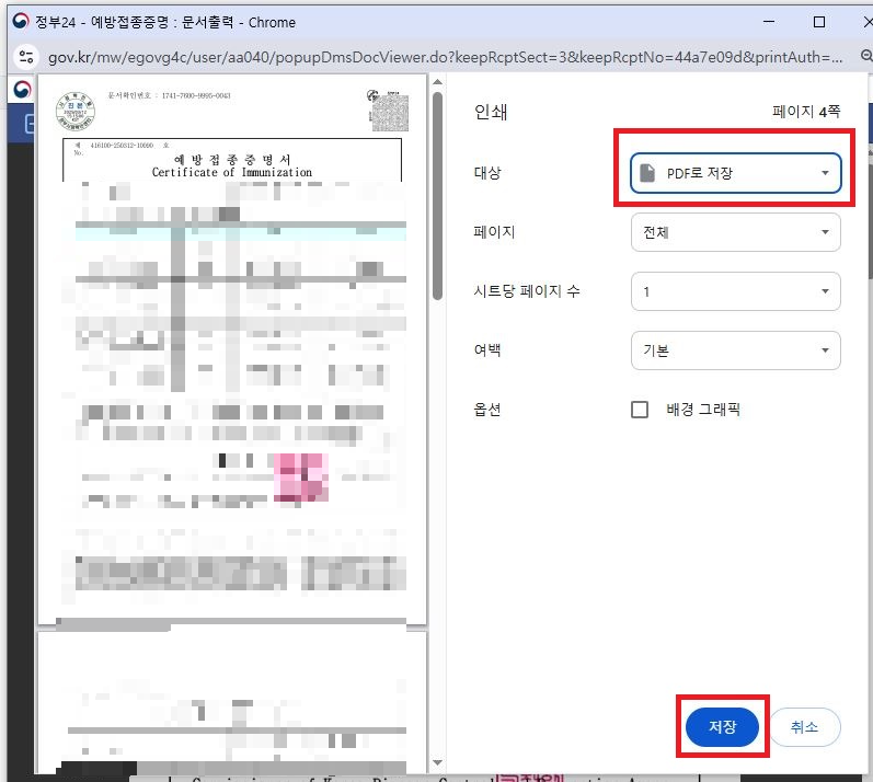 [PDF로 저장] 설정을 하고 우측아래 저장을 눌러주면 컴퓨터에 파일로 저장된다.