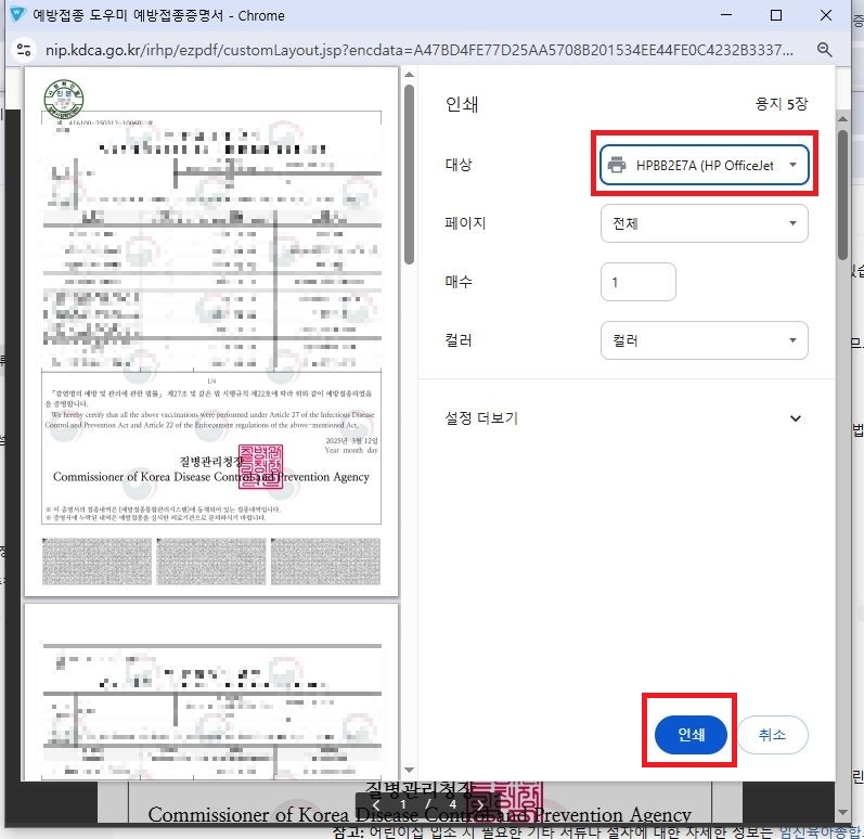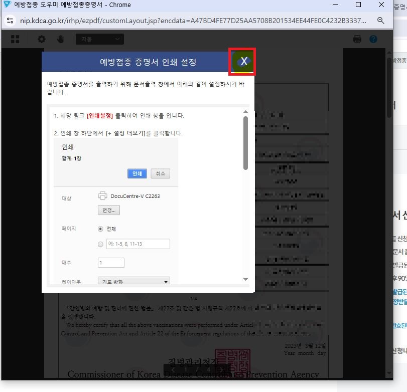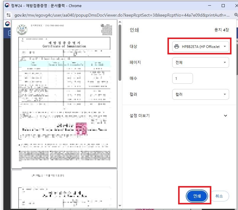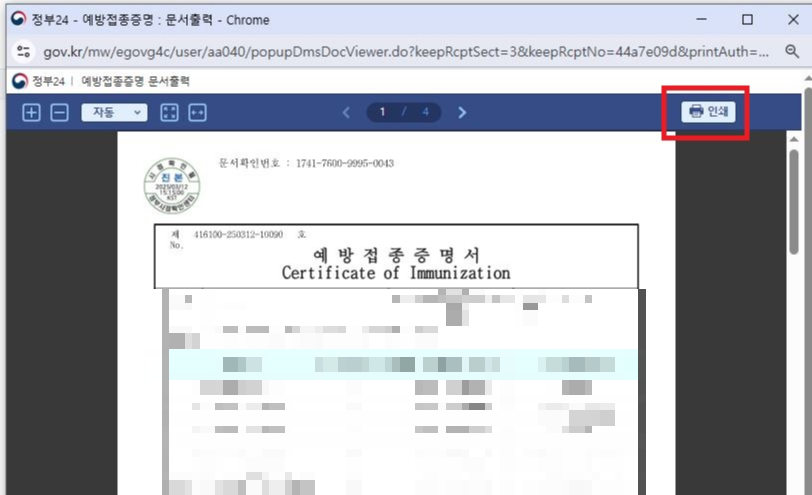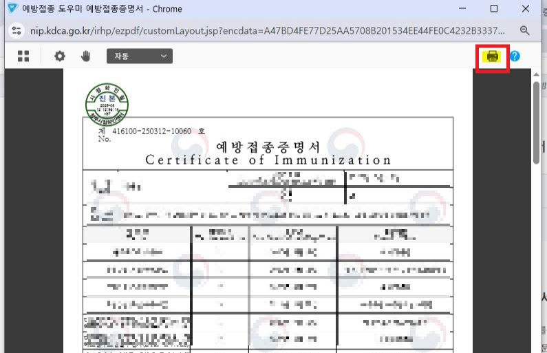 미리 보기가 나오면 프린트 모양 아이콘을 눌러준다.