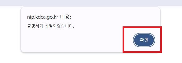인증이 끝나면 증명서가 신청되었다는 팝업이 뜬다.