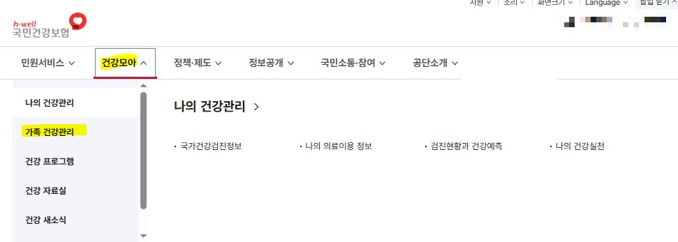 로그인을 하고 나면 맨 위 메뉴에서 건강모아 > 나의 건강관리> 가족건강관리로 들어간다.