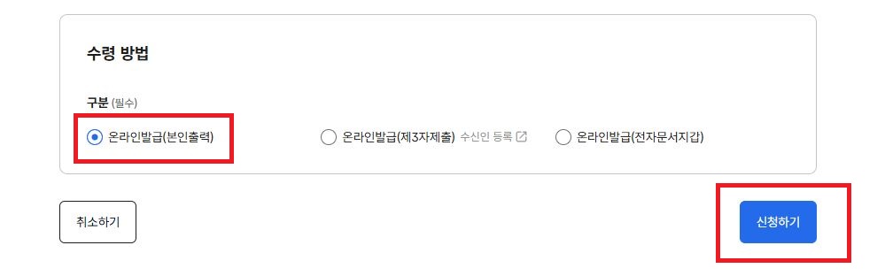 [온라인 발급] 선택하고 [신청하기]를 누른다.