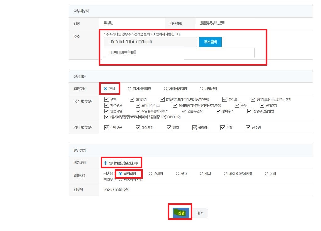 신청내용은 전체로 하고 인터넷발급 어린이집 제출용으로 신청한다.