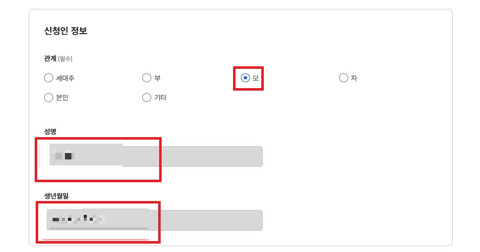 관계 선택한다. 신청인의 성명과 생년월일은 자동입력된다.