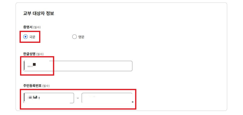 [국문] 증명서를 선택하고 아이 이름과 주민번호를 입력한다.