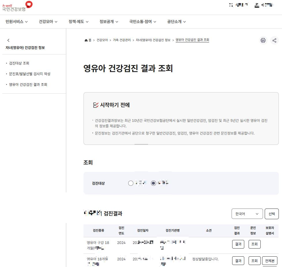 검진대상에서 출력을 원하는 자녀이름 앞에 체크하면 검진 결과가 나온다.