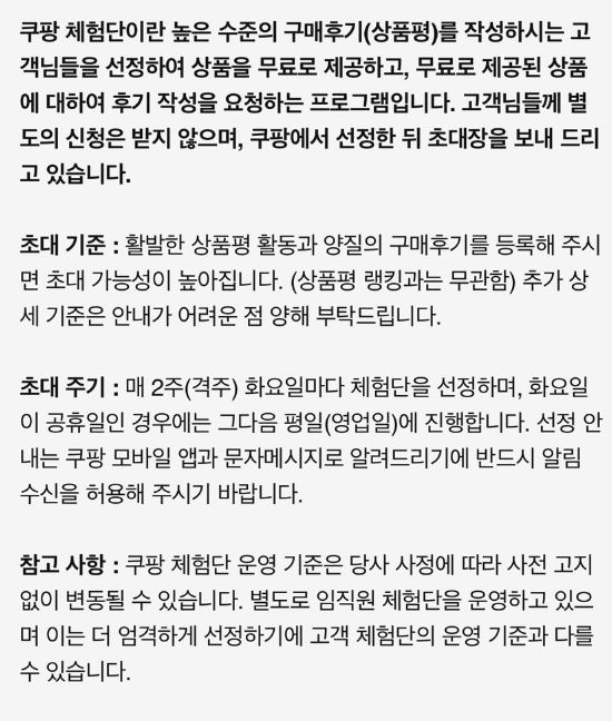 양질의 구매후기를 작성할 경우 초대 확률이 높아진다고만 명시하고 있다.