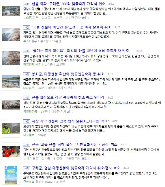 한 기사에는 마을 주민들의 대피를 도왔으나 구순이 넘은 노모를 화마로 잃은 안타까운 이야기도 접했다.