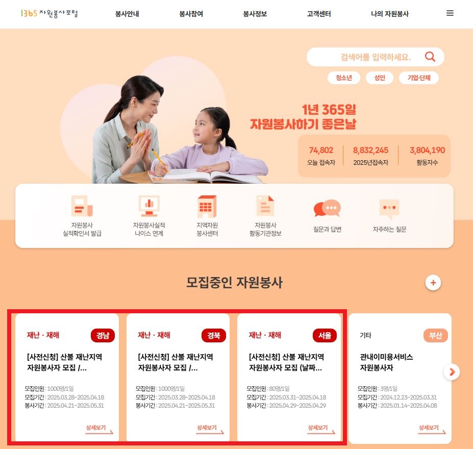 ✔️ 자원봉사 신청 사이트: **자원봉사포털사이트(1365)**와 같은 웹사이트에서 산불 피해자 지원 자원봉사를 모집하는 공고를 확인하고 지원할 수 있습니다.